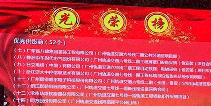 近日,我司在廣州地鐵六號(hào)線二期廣州軌道交通工程勞動(dòng)競(jìng)賽2016年度總結(jié)表彰暨2017動(dòng)員會(huì)中,連續(xù)榮膺廣州地鐵“優(yōu)秀供貨商”稱號(hào)。